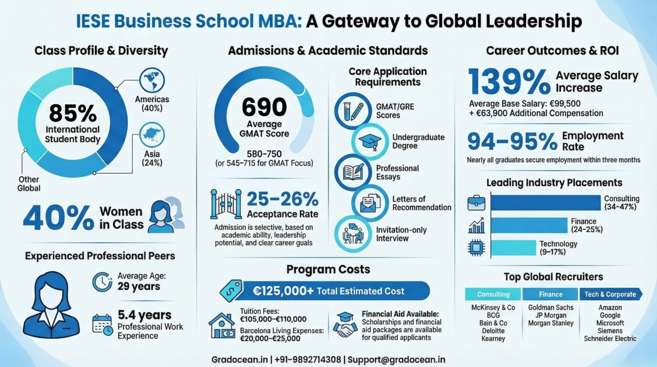 The MBA at IESE Business School is one of the leading MBA programs in Europe and is widely recognized for its strong placement outcomes in consulting, finance, and technology. The school is part of the University of Navarra and operates campuses in Barcelona, Madrid, Munich, New York, and São Paulo.