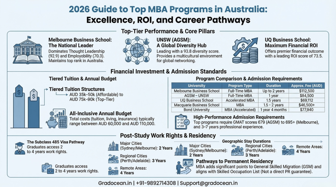 Melbourne Business School remains the national leader, particularly in employability and thought leadership. UNSW (AGSM) distinguishes itself through superior global diversity, while UQ Business School is identified as providing the premier financial outcome regarding ROI. Australia continues to be a top-tier destination for international candidates due to strategic advantages, including extended post-study work rights, comparative affordability to US and UK programs, and viable, albeit indirect, pathways to permanent residency.