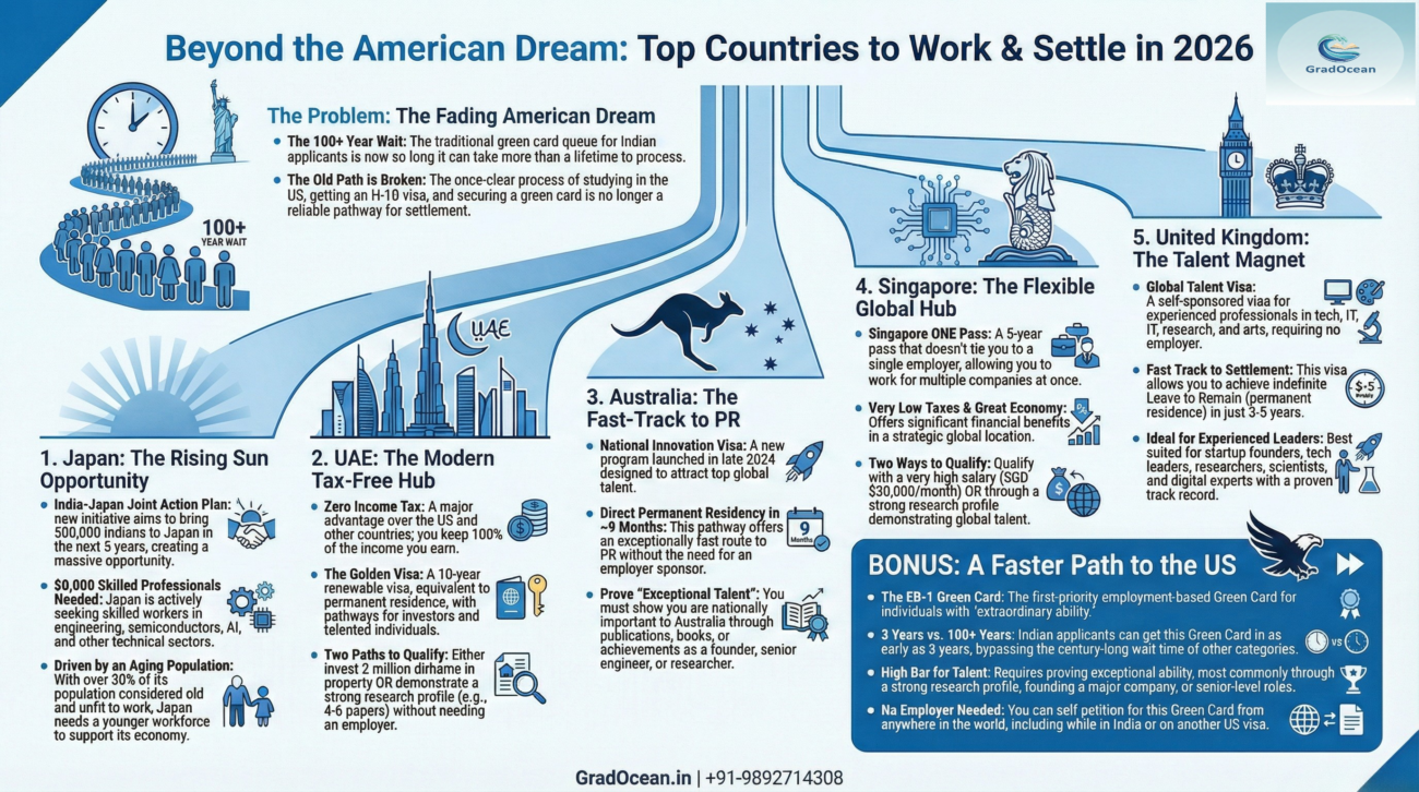 In 2026, long employment-based Green Card backlogs—especially for Indian nationals—have made the traditional H-1B to Green Card pathway highly uncertain. Many professionals are shifting toward merit-based immigration systems in countries like Australia, the UAE, Japan, and Singapore that offer faster and more predictable permanent residency options.